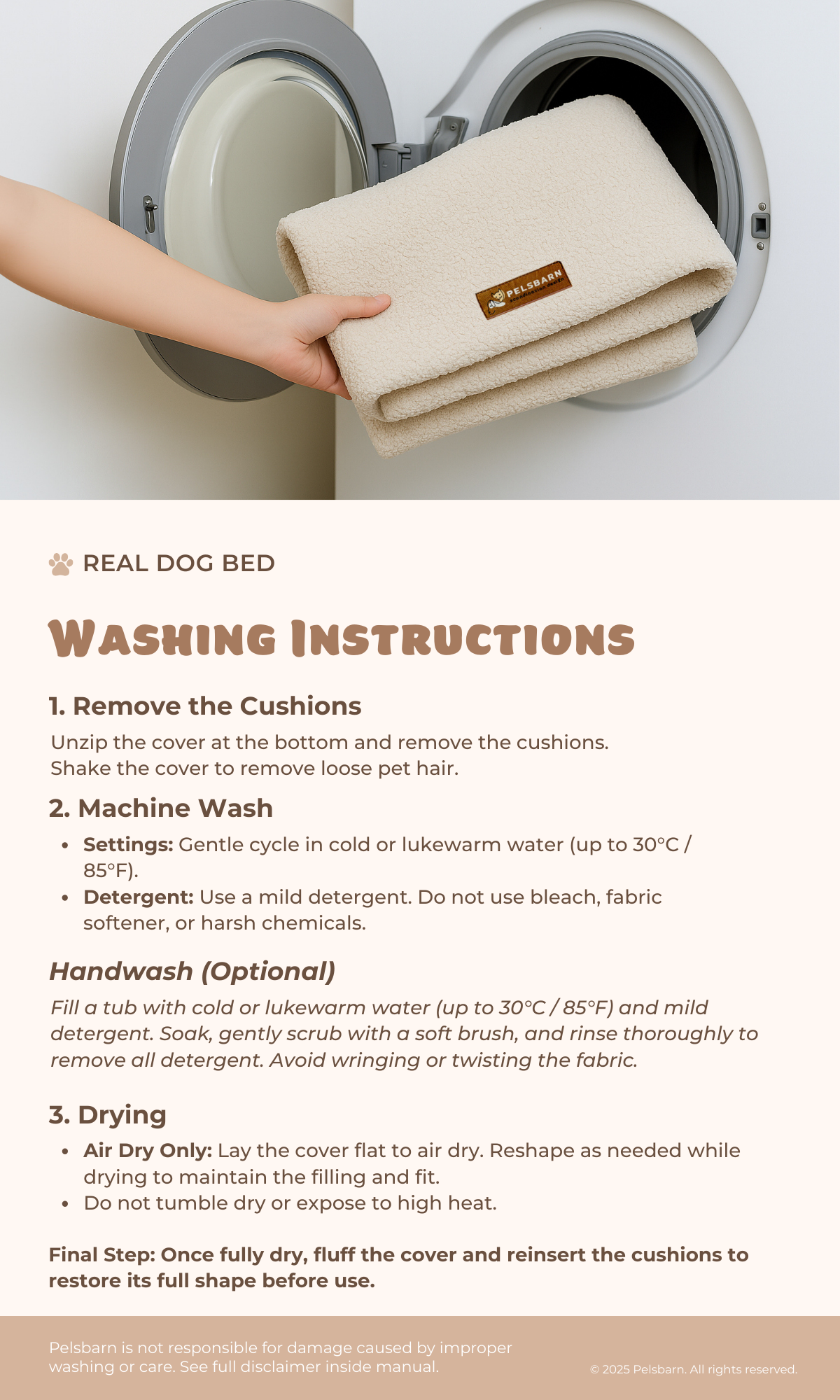 Real Dog Bed CareUpdated a month agoHere are the instructions on how to wash and reshape your Pelsbarn Real Dog Bed. Was this article helpful? YesNo